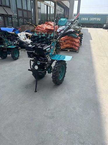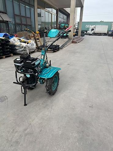 Комплектация на фото: мотоблок на колесах с фарой, передней стойкой и крыльями. Цвет — бирюзовый.