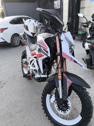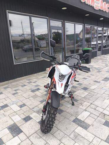 Мотоцикл эндуро/кросс, белый пластик. Легкая рама, высокий клиренс, передняя длинноходная вилка, задний моноамортизатор. Колеса со спицами: внедорожная резина с выраженным протектором, дисковые тор...