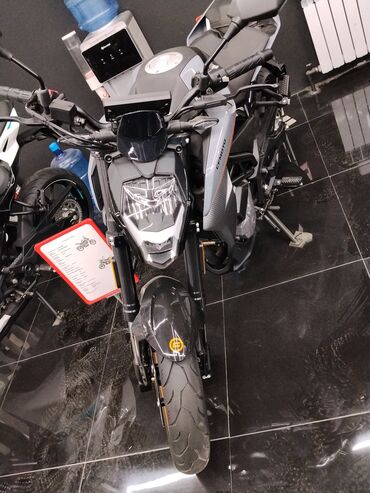 - Нейкед с яркими акцентами: светодиодная круглая фара с DRL, высокий прямой руль, цифровая приборная панель, дисковые тормоза спереди и сзади, дорожные шины универсального профиля, двухуровневое сиденье.