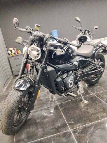 - Классический крузер в чёрном цвете: широкий передний обод, массивные крылья, круглая светодиодная оптика с ДХО, продольный двухместный сид, прямой руль, защитные радиаторные кожухи, передние и задние дисковые тормоза, центральная и боковая подставка.