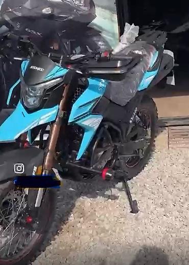 Мотоцикл Stels (Stels/Stealth — надпись на облицовке), дорожный эндуро/адвентур в ярком голубом цвете с черными элементами. Тех паспорт с номерам