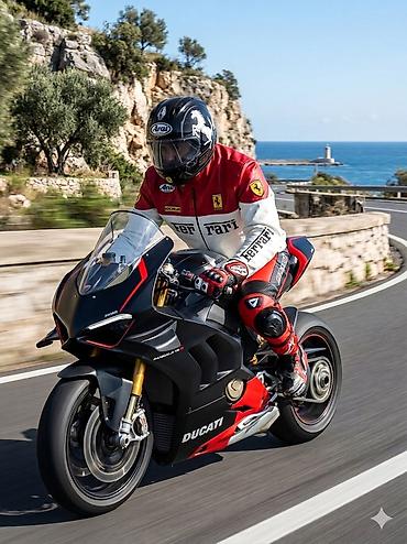 - Логотипы и нашивки: Ferrari спереди и на плечах, а также стилизованные нашивки Arai и Michelin.