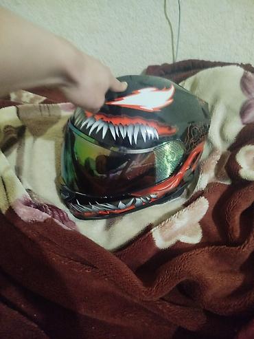 Мотошлем интеграл с агрессивным графическим принтом “клыки/хищник” и зеркальным визором.