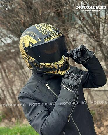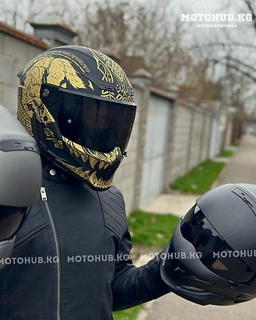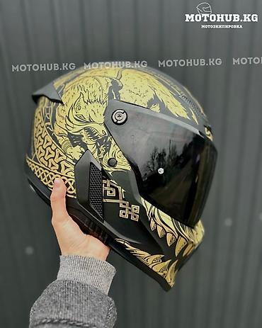 Ruroc ATLAS Fenrir Полноразмерный мотоциклетный шлем с визором, агрессивным аэрографическим дизайном в черно‑золотой гамме.