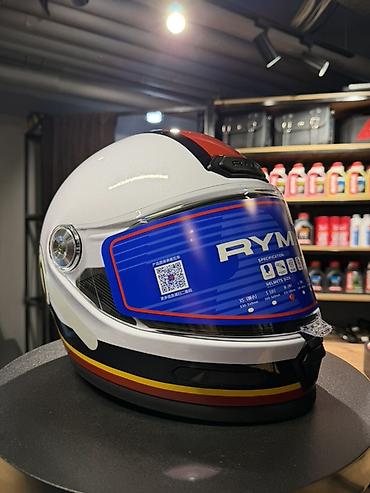 Мотошлем интеграл с визором и вентиляцией - Тип: полно-лицевой (integral) с откидным прозрачным визором. - Дизайн: ретро-стиль, кремовый цвет с красными и темно-синими полосами, глянцевое покрытие...