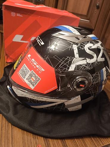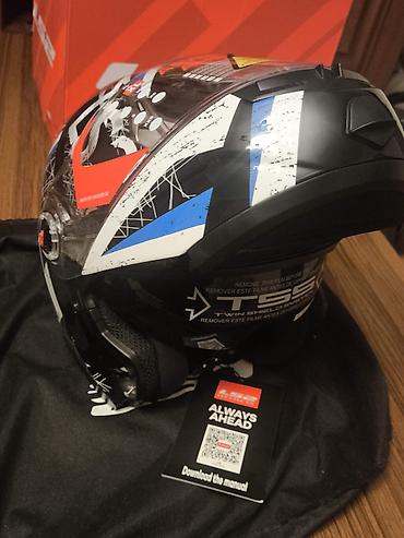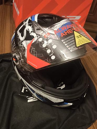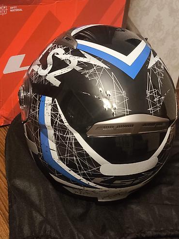 Мотошлем модуляр (поднимается подбородок и визор). - Цвет: белый глянец с черными вставками. - Зеркальный синий визор с антибликовым эффектом, поднимается; под ним прозрачный базовый экран. - Вс...