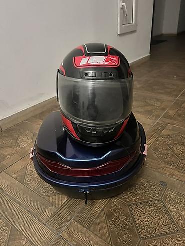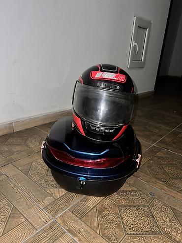 Идеальный комплект для скутера или мотоцикла: защита головы и удобное хранение вещей в поездке. Размер шлема визуально стандартный взрослый; кофр крепится на багажник/площадку (монтажный комплект не виден на фото).
