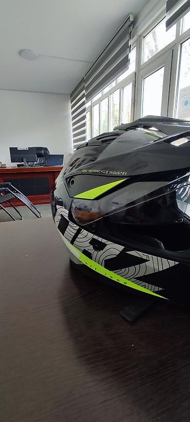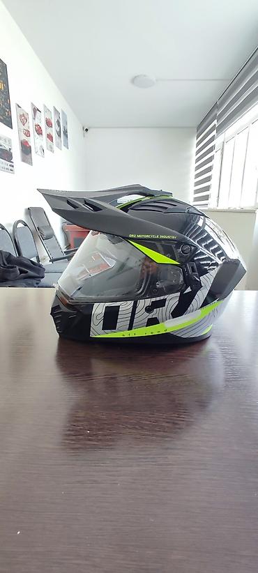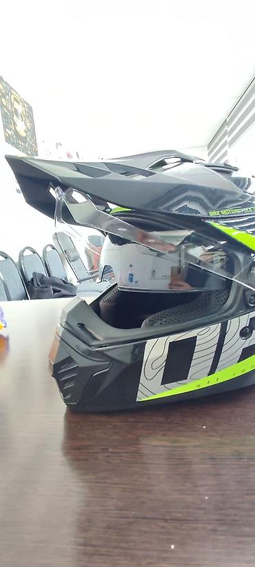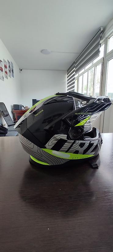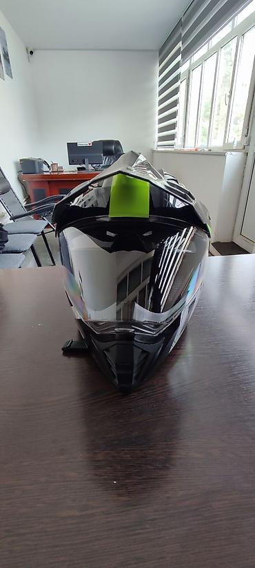 Мотошлем кроссово-турингового типа с визором и козырьком.