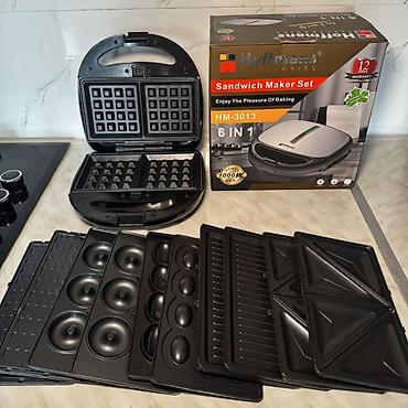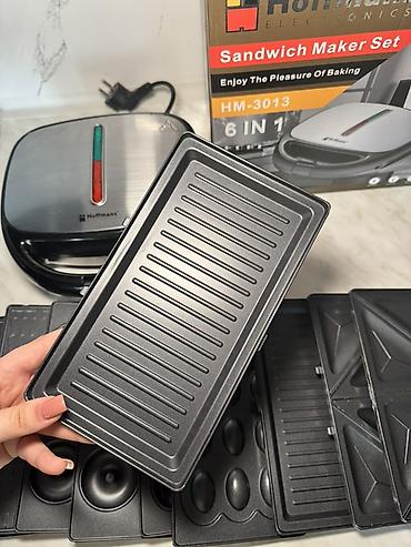 - 6 сменных антипригарных панелей: вафельная, треугольные сэндвичи, гриль, пончики, орешки, тонкие вафли