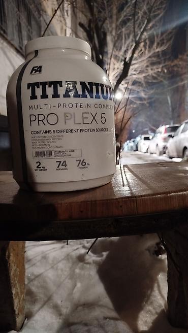 - Информация на упаковке: 2 kg net weight, 74 servings, 76% protein; FA Titanium Multi-Protein Complex Pro Plex 5