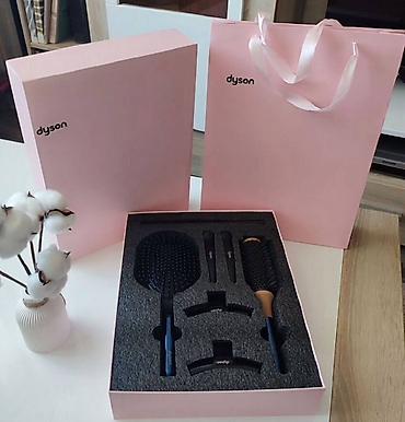 - фирменный набор аксессуаров Dyson в розовой коробке: большая подушка-щетка, круглая брашинг-щетка, две заколки-«крокодилы», две тонкие шпильки-укладчики;