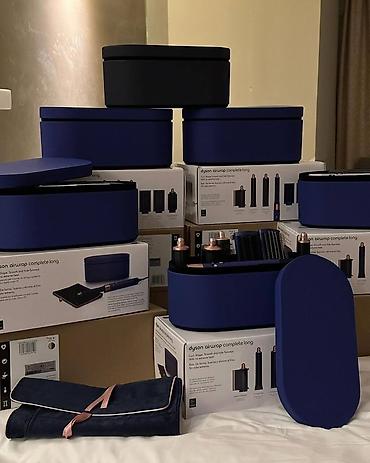 На фотографиях представлены разные цветовые варианты лимитированных наборов Dyson Airwrap Complete Long с фирменными аксессуарами для хранения.