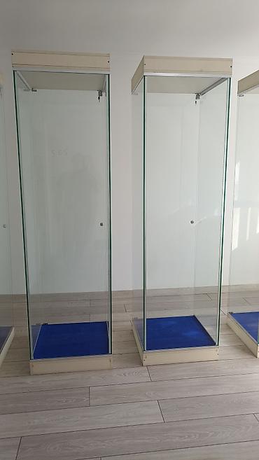 Торговые стеклянные витрины (2 шт.) - Узкая синяя витрина-колонна: - Корпус: металлический профиль, стеклянные стенки и дверь - Цвет каркаса: синий - Регулируемые держатели под стеклянные по...