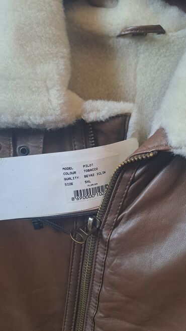Классический крой авиатор («pilot») с объёмным меховым воротником и тёплой подкладкой. Подходит для зимы и межсезонья, сочетает брутальный стиль и комфорт. На фото — оригинальные бирки: Model PILOT, Colour TOBACCO, Size 5XL.