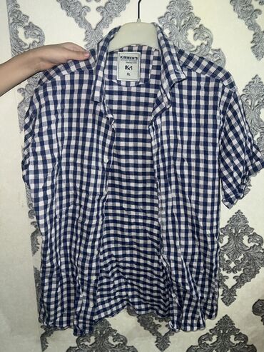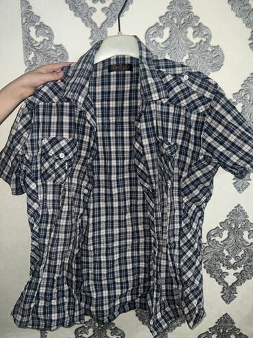 3) Клетчатая рубашка LONELI, короткий рукав. Сине‑бело‑серая клетка, два нагрудных кармана с клапанами на пуговицах, плечевые погоны, классический воротник, застёжка на пуговицы. Кэжуал.