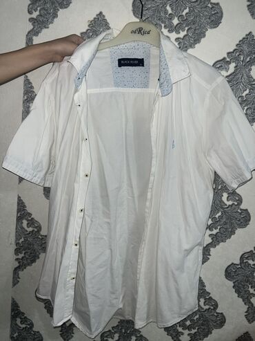 4) Белая рубашка BLACK RIVER, короткий рукав. Контрастная внутренняя стойка воротника со светло‑голубым микропринтом, пуговицы светлого цвета, классический крой, планка на пуговицах.