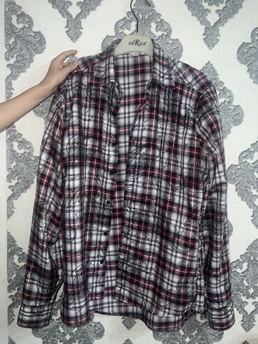 2) Клетчатая рубашка с длинным рукавом (белый/чёрный/бордовый). Принт клетка с поверхностным узором, классический воротник, планка на пуговицах, манжеты на пуговицах. Повседневный стиль.