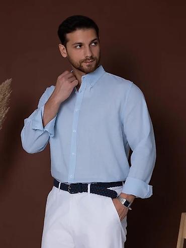 Мужские классические рубашки с длинным рукавом (2 штуки) - Модели: темно-синяя(100% лён, 1500 сом) и голубая(500 сом). - Крой: прямой, с отложным воротником и планкой на пуговицах. - Рукава с манж...