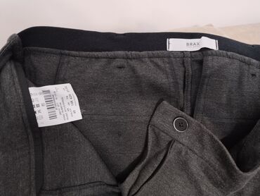 - Пара 2: однотонные темно‑серые. Прямой силуэт, стрелки, шлевки под ремень, боковые карманы, один задний карман на пуговице. Пояс с контрастной внутренней отделкой.