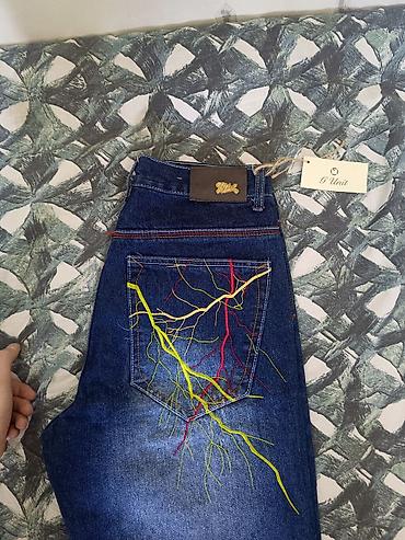 - Дизайнерский акцент на заднем кармане: крупная машинная вышивка ветвистого узора в неоновых цветах (лаймовый, красный, жёлтый), заходящая ниже кармана.