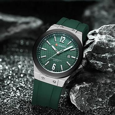 - Дизайн: спортивно-классический, зелёный циферблат с текстурой “клёпка”, контрастные метки и цифры 12/6.