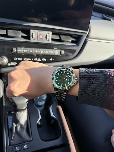 - Стиль: дайверский дизайн с зелёным циферблатом “sunburst” и зелёным однонаправленным безелем с минутной разметкой (0–60).