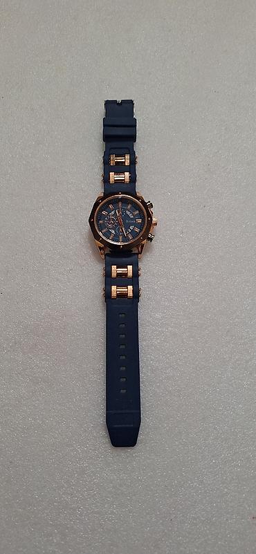 - Ремешок: синий, эластичный (силикон/каучук) с декоративными металлическими вставками под цвет корпуса, классическая пряжка