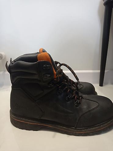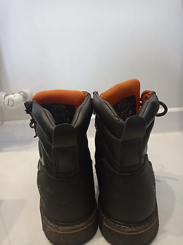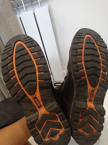 - Материалы: верх из плотной кожи/искусственной кожи, усиленные накладки; подкладка оранжевого цвета из дышащего текстиля; толстая маслобензостойкая рифленая подошва.