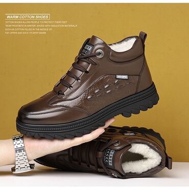 Зимние кожаные ботинки MICHELLINO, унисекс. - Материал верха: натуральная кожа (коричневый цвет). - Подкладка: тёплый искусственный мех/шерпа по всей внутренней части, включая язычок. - Шнуровка: ...