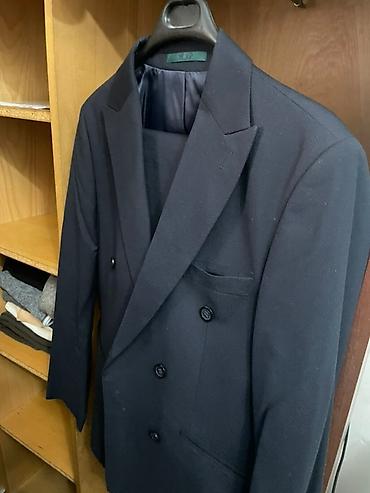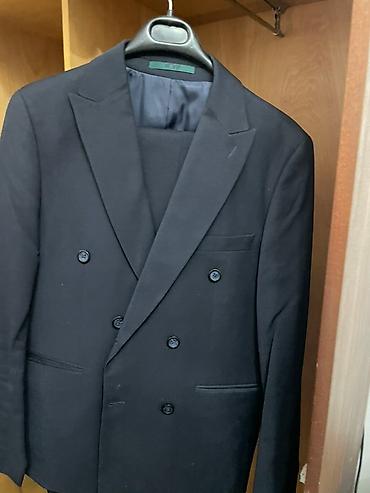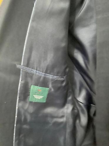 Двубортный мужской пиджак темно‑синего цвета.