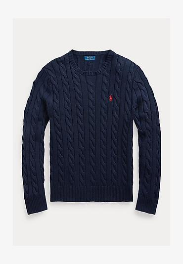 Мужской свитер Polo Ralph Lauren - Модель: классический джемпер с круглым вырезом - Цвет: тёмно-синий (navy) - Узор: фирменная «косичка» (cable knit) - Логотип: вышивка Polo player красного цвета ...
