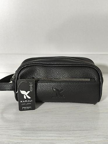 - Сумка-барсетка KARALI из чёрной фактурной кожи (логотип на лицевой стороне)