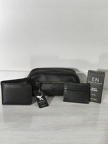 Стильный и практичный комплект в едином чёрном цвете: всё необходимое для повседневного использования и в качестве подарка. Материалы — кожа, надёжная фурнитура, аккуратная строчка. Парфюм в фирменной коробке.