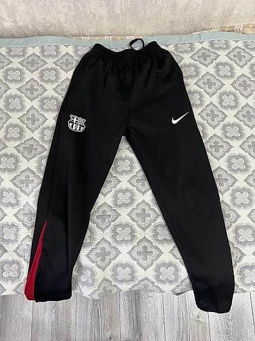 - Черные спортивные брюки Nike с эмблемой FC Barcelona на бедре и фирменным «swoosh». Прямой крой, зауженные книзу, эластичный пояс со шнурком, красные вставки внизу штанин.