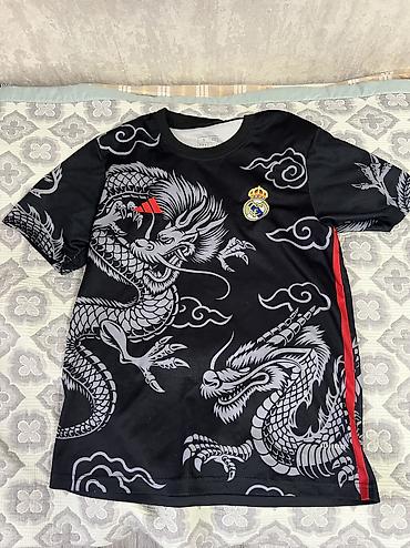 - Черная тренировочная футболка с графикой «дракон», эмблемой Real Madrid на груди и фирменными полосками/вставками. Круглый вырез, короткий рукав, материал с быстрой влагoотводимостью (AEROREADY отмечено на подоле).