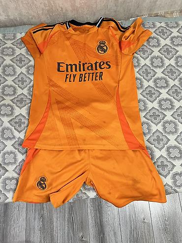 - Комплект для футбола Real Madrid: оранжевая футболка с коротким рукавом + шорты в тон. На футболке и шортах — эмблема клуба, спонсорский логотип Emirates Fly Better. Ворот круглый, плечевые вставки, легкая дышащая ткань.