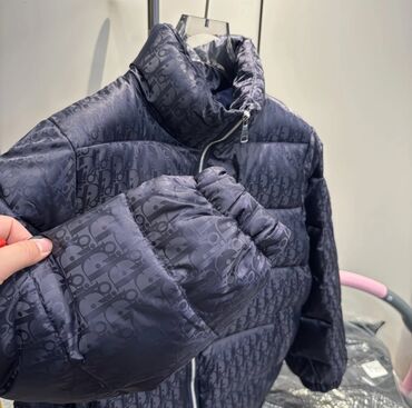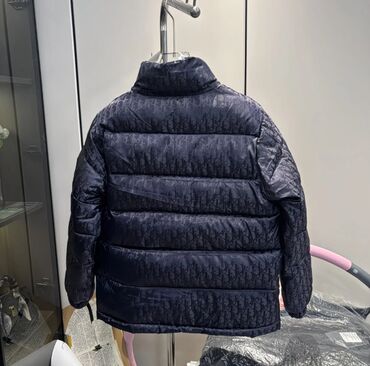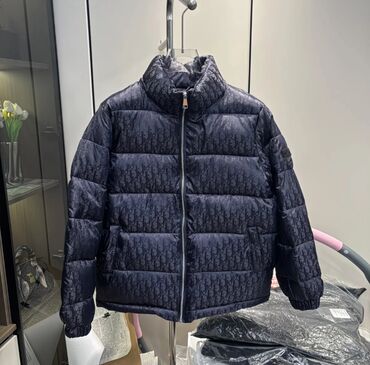 Пуховик мужской, темно-синий, с геометрическим монограммным принтом по всей поверхности.