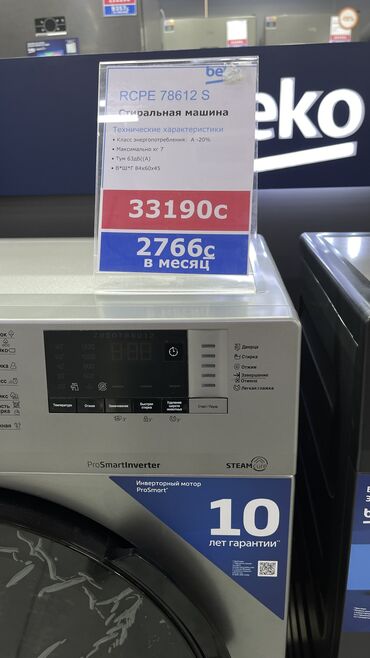 На изображении представлена стиральная машина Beko RCPE 78612 S. Основные характеристики: Загрузка: 7 кг. Скорость отжима: 1200 об/мин. Класс энергоэффективности: A+++. Тип мотора: Инверторный Pro...