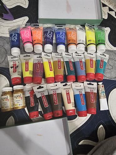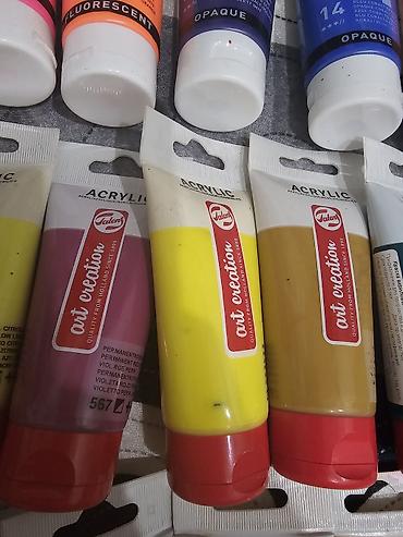 - Talens Art Creation Acrylic (тубы разных объёмов): фиолетовый Permanent Red Violet 567, жёлтый, охра/жёлто-коричневый, красный, синий, бирюзовый, серый, чёрный, телесный/беж, коричневый, и др. оттенки