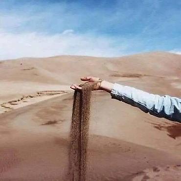 - Пустынный сюжет: струящийся песок в руке на фоне дюн и голубого неба.