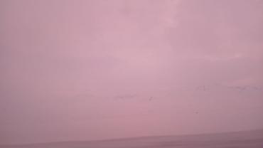 - Нежный розово‑лиловый пейзаж с мягкими облаками и еле заметными горами на горизонте.