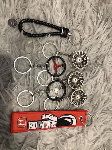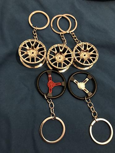 - 2 брелока-миниатюры рулей: один с красными спицами, второй с серебристыми (черное «обод» рулевого колеса, металлическая цепочка и кольцо).