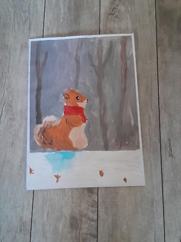 - Белка в зимнем лесу в красном шарфе; следы на снегу и голубая лужица/отблеск.