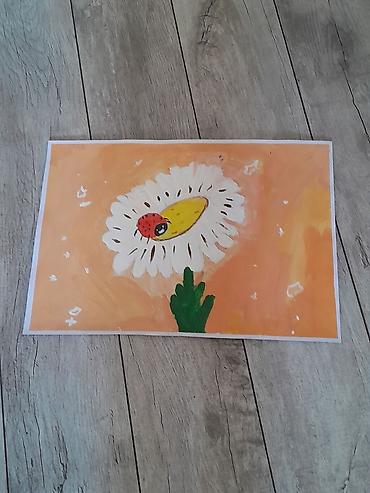 - Ромашка на персиковом фоне с божьей коровкой на лепестках.