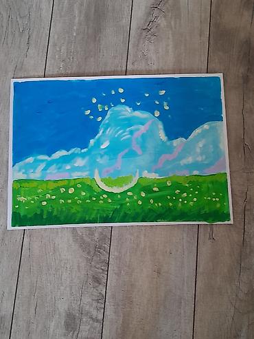 - Летний пейзаж: зеленое поле с одуванчиками, большие облака на ярко‑синем небе, солнечные отблески.