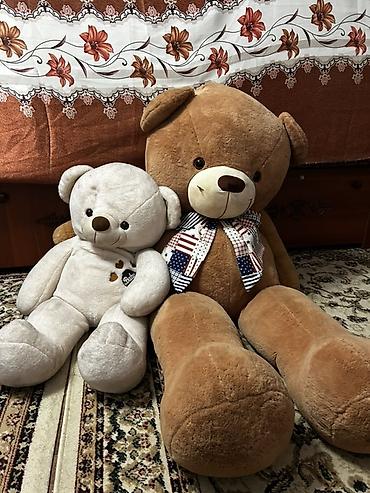 - Размеры: один крупный медведь очень большого размера (примерно с сидящего взрослого по высоте), второй — средний, заметно меньше. Подойдут как объёмный декор в комнате и для объятий.