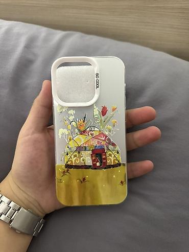 1) Светлый чехол с рисунком юрты и цветами. Контрастный многоцветный принт. Крупное утолщенное кольцо-рамка на блок камер с надписью “SO COOL”.