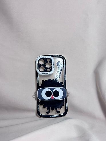 - Прозрачный чехол с черной окантовкой и надписями monster, с крупным рисунком пушистого монстрика и широкой держатель-лямкой на липучке на тыльной стороне; отдельная декоративная рамка на блок камер в том же стиле.