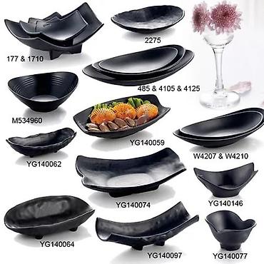 - Формы: прямоугольные, квадратные, овальные и лодочки; есть плоские блюда, глубокие тарелки, пиалы и мини-чаши для соусов