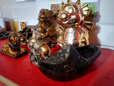 Украсят полку, камин, рабочий стол; подходят для коллекции, зонирования интерьера и тематических композиций (восточная символика, фэншуй). Размеры — от миниатюрных до средних; изделия устойчивые, с плоским основанием. Цветовая гамма: золото, бронза, черный.